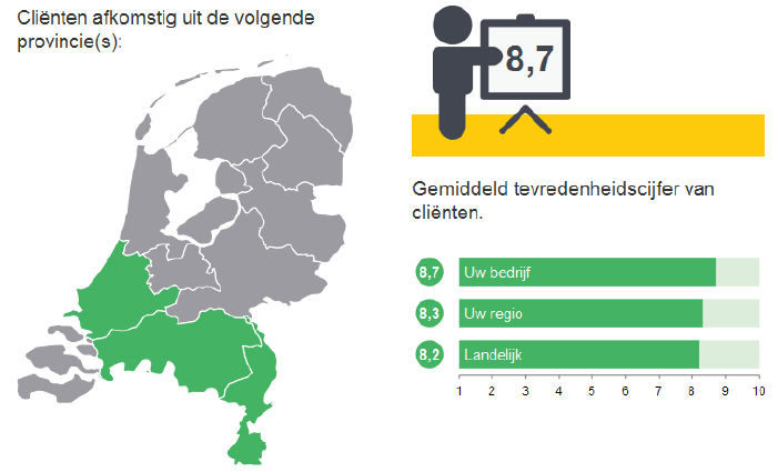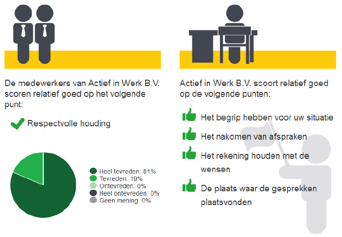 In de meetperiode 2023/2024 heeft Onderzoeksbureau Panteia in opdracht van Blik op Werk wederom de tevredenheid van de cliënten en opdrachtgevers van Actief in Werk anoniem onderzocht. Daaruit is het volgende (gemiddelde) rapportcijfer naar voren gekomen: zowel cliënten als opdrachtgevers waardeerden de dienstverlening van Actief in Werk met een 8,7. Actief in Werk heeft daarbij wederom het hoogste aantal haalbare sterren (vier) behaald.