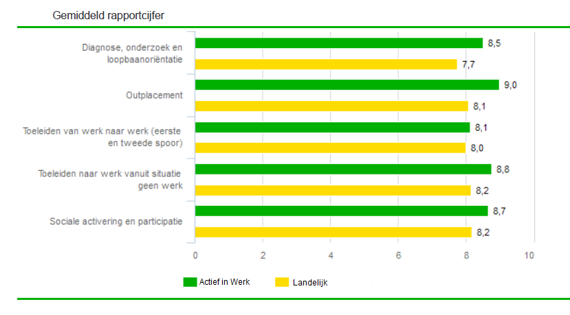 De tevredenheid van cliënten die een re-integratietraject vanuit UWV hebben gevolgd in 2021 (meetperiode 01-01-2021 t/m 31-12-2021) is ook onderzocht. Cliënten die een Werkfit maken traject hebben afgerond waardeerden de dienstverlening van Actief in Werk met een 8,4. Cliënten die een Naar werk traject hebben afgerond waardeerden de dienstverlening van Actief in Werk zelfs met een 9,3.