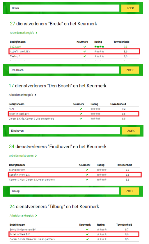 Actief in Werk heeft op basis van het behaalde cijfer in combinatie met vier sterren ook het komende jaar weer een prominente plek verdiend in de top 3 in de ranglijst van re-integratiebedrijven van Blik op Werk in Brabant (voor zowel de regio Breda, Den Bosch, Eindhoven als Tilburg).