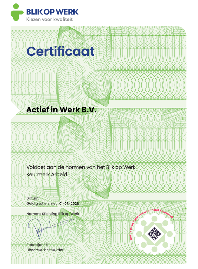 De kwaliteit van onze dienstverlening wordt bepaald door de tevredenheid van onze cliënten, opdrachtgevers en partners waarmee wij samenwerken. Actief in Werk is al geruime tijd in het bezit van het onafhankelijke Blik op Werk keurmerk (www.blikopwerk.nl). Dit keurmerk staat borg voor de kwaliteit, tevredenheid en professionaliteit van de organisaties die zijn aangesloten bij het keurmerk. Als onderdeel van het Blik op Werk keurmerk vindt er jaarlijks een audit plaats door TÜV Rheinland Nederland B.V. waarbij zaken als privacy, kwaliteit, personeelsinzet, processen en behaalde resultaten worden onderzocht. Het keurmerk garandeert dat je samenwerkt met een betrouwbaar bedrijf dat aantoonbare resultaten boekt. Actief in Werk is in het bezit van het hoogst aantal behaalbare sterren (vier).
